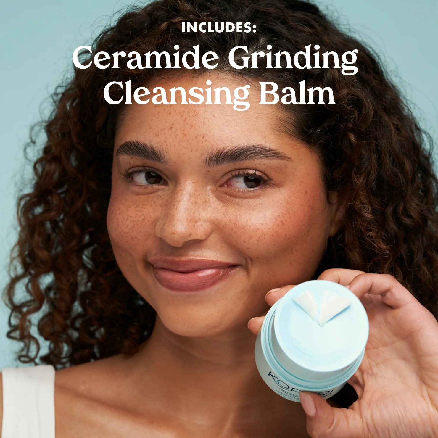 Start with our Ceramide Grinding Cleansing Balm—an innovative twist-up balm that melts away makeup, SPF, and impurities with zero mess and zero stripping. Follow with the Moisture Whipped Ceramide Cream, a clinically proven moisturizer that delivers 72 hours of hydration while strengthening and restoring your barrier. Finish with Lip Love in Soft Vanilla, a buttery balm that smooths, hydrates, and locks in moisture with a hint of shimmer and a kiss of vanilla.